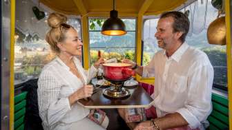 Simplemente se derrite la boca: la clásica fondue de queso suizo, servida al aire libre en la acogedora góndola del Hotel Belvedere Grindelwald.